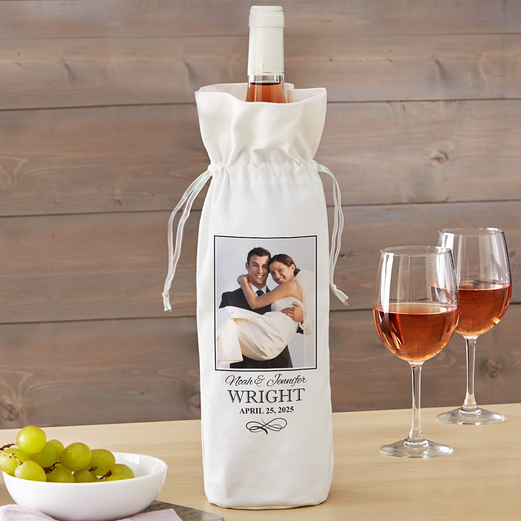 Finding a tasteful wedding (or engagement, shower or anniversary) gift is a cinch with this picture-perfect wrapper for a very special bottle of wine or bubbly. Made of 100% cotton Machine washable Personalize with your photo, any 2 names up to 10 characters each, last name up to 12 characters and date Photo measures 3"Wx4"H Measures 14"Hx6-1/2" dia