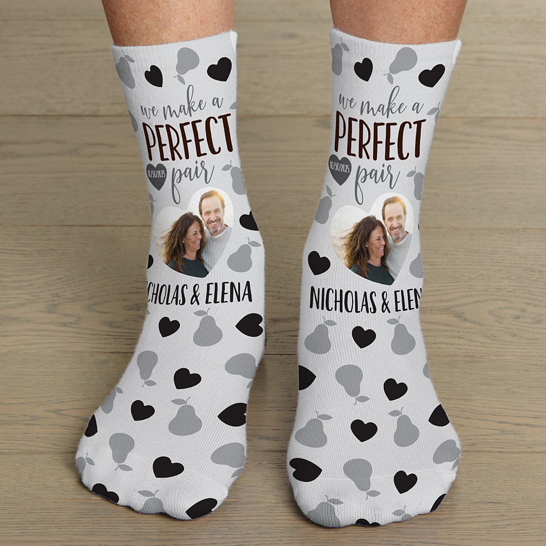 Youre a (perfectly) matched set—and these socks prove it! This lighthearted “pear” make a sweet gift for your honey. Unisex crew socks made of polyester/spandex blend Measures 3.5"x13.5"; Fits Mens size 6-11; Fits Women up to size 12 Personalize with any photo, 1 line message up to 18 characters and numeric date Machine washable