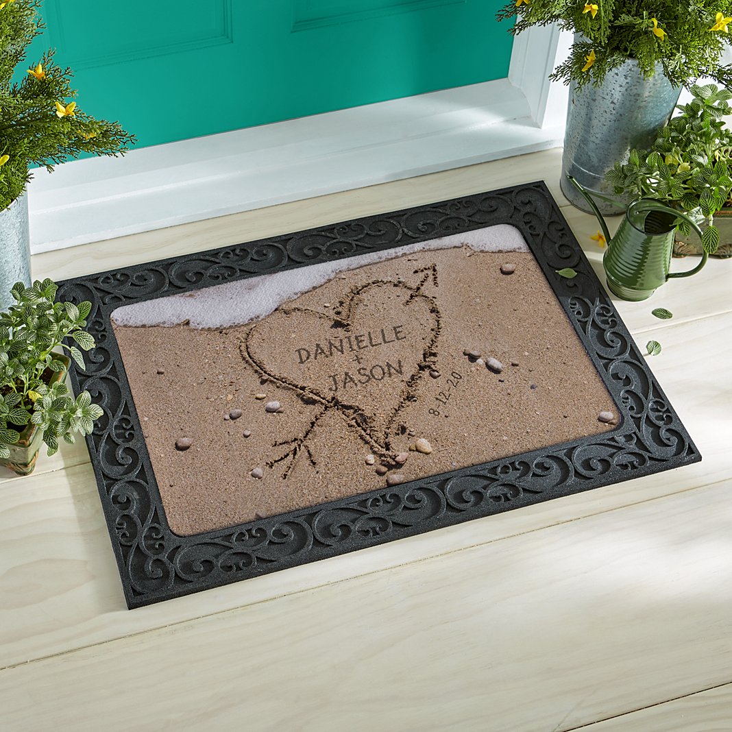 Celebrate memories of romantic strolls on the beach with a gift that showcases their love. Our Heart in Sand Collection honors the timeless tradition of sweethearts drawing their names in the sand, letting all who see it know they are truly made for each other. Made from durable polyester surface and non-slip rubber backing Suitable for indoor or outdoor use Offered with or without a decorative rubber scrollwork holder Thoughtfully personalize with any 2 names up to 12 characters each, joined by a "+" sign Choose from 2 sizes: 17"x27" or 24"x36" with and without holder Cleans easily with soap and water Gift box not available Proudly made in the USA