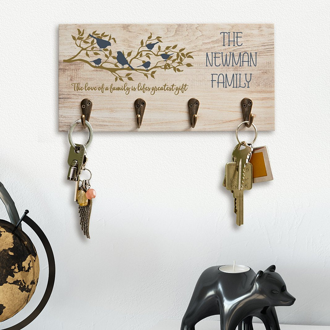 This sweet and stylish celebration of family makes the perfect perch for your entire flock's keys. Made of MDF wood Includes 4 hooks and sawtooth hanger Measures 24"Wx10.5"Hx2.3"D (including hooks) Choose number of birds: for 2 parents 1 to 4 kids; 1 parent 1 to 4 kids or a couple Personalize with any message (underneath the branch) up to 50 characters and 1 to 3 line message up to 15 characters each Wipe clean with damp cloth Some assembly required Item cannot be gift boxed