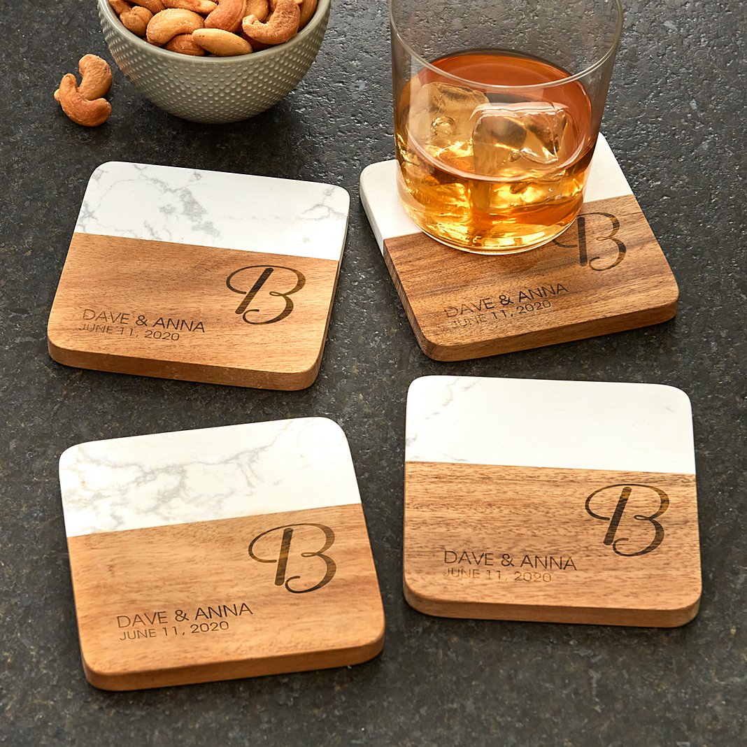 The happy couple will be amazed how this sophisticated mix of marble and wood elevates their beverage-drinking experience. Exclusively from Personal Creations. Made of acacia wood and faux marble Due to natural variation of wood and marble, each coaster will be unique Set of 4, each measures 4" sq.