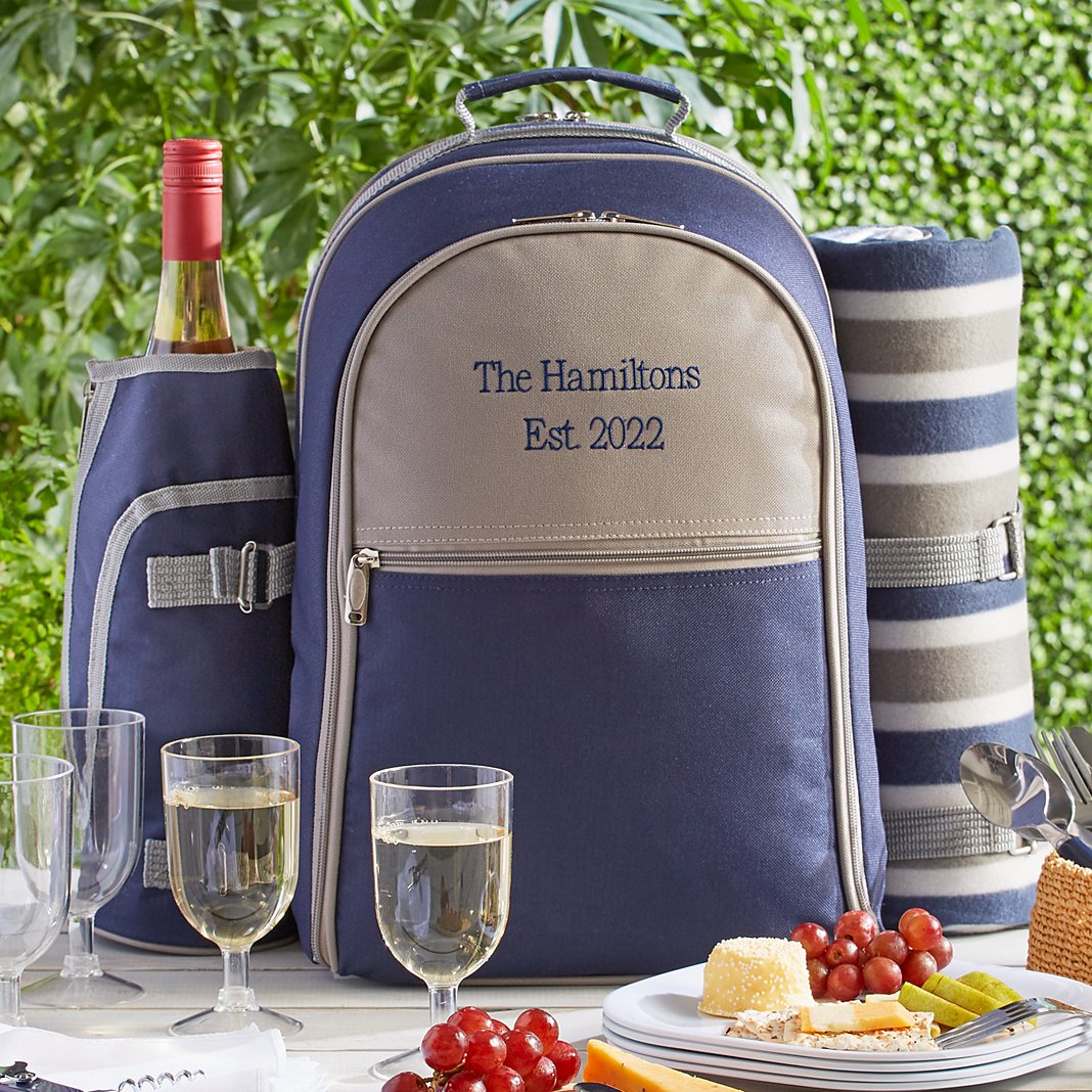 Dine al fresco in style with a complete picnic service for four. This deluxe backpack is designed for carrying comfort, and even includes an insulated compartment, detachable wine cooler and blanket. Made of polyester canvas Measures 18"Lx7"Wx16"H Contents include detachable wine cooler, felt blanket, 4 melamine plates, 4 wine goblets, 12 piece flatware set, 4 napkins, bread knife, wooden cutting board, salt and pepper shakers and sommelier's corkscrew Backpack includes padded shoulder straps for comfort, insulated main compartment to keep food cold Embroider with any 1 or 2 line message up to 15 characters each Item cannot be gift boxed