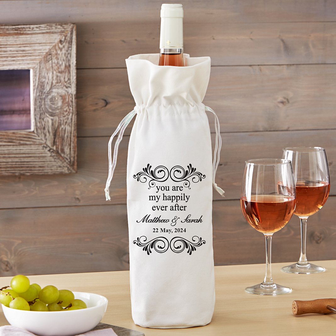 Dress up a bottle of fine wine and drink to the lifelong happiness of the newlyweds (or a favorite couple) with our wine bag featuring a vintage design and fairy tale sentiment. Made of 100% cotton Measures 14"Hx6-1/2" dia Machine washable Personalize with any message up to 28 characters and date up to 18 characters