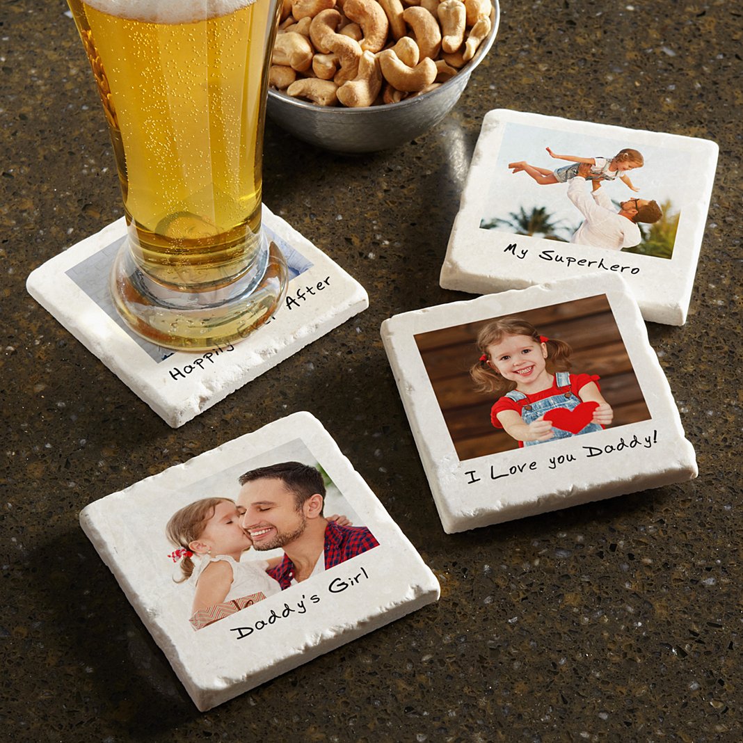 A coaster and photo display in one! The captioned photos make a fun conversation starter, even before drinks are served. Made of tumbled stone with chiseled edges Protective cork backing Set of 4, each measures 4" sq Photos measure approx. 3"x3.5" Available with coasters only or coasters with holder Available in single photo/message or multiple photo and message Upload 1 to 4 photos Natural variations in the stone may slightly alter the image