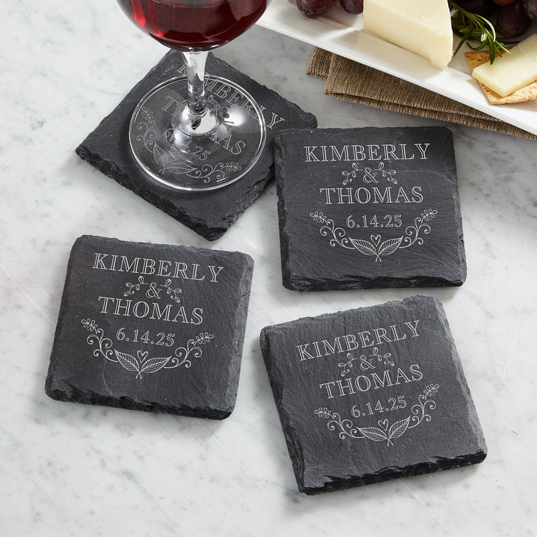 Gift the loving couple—or yourself—these natural slate coasters for a sophisticated (and useful) reminder of a very special day. Made of slate with sturdy backing for stability Set of 4, each measures 4" sq Engrave with any 2 names up to 10 characters each and numeric date ”&” will always appear between names Due to natural slate stone material and uneven ridges, engraving may vary between coasters Wipe clean with damp cloth