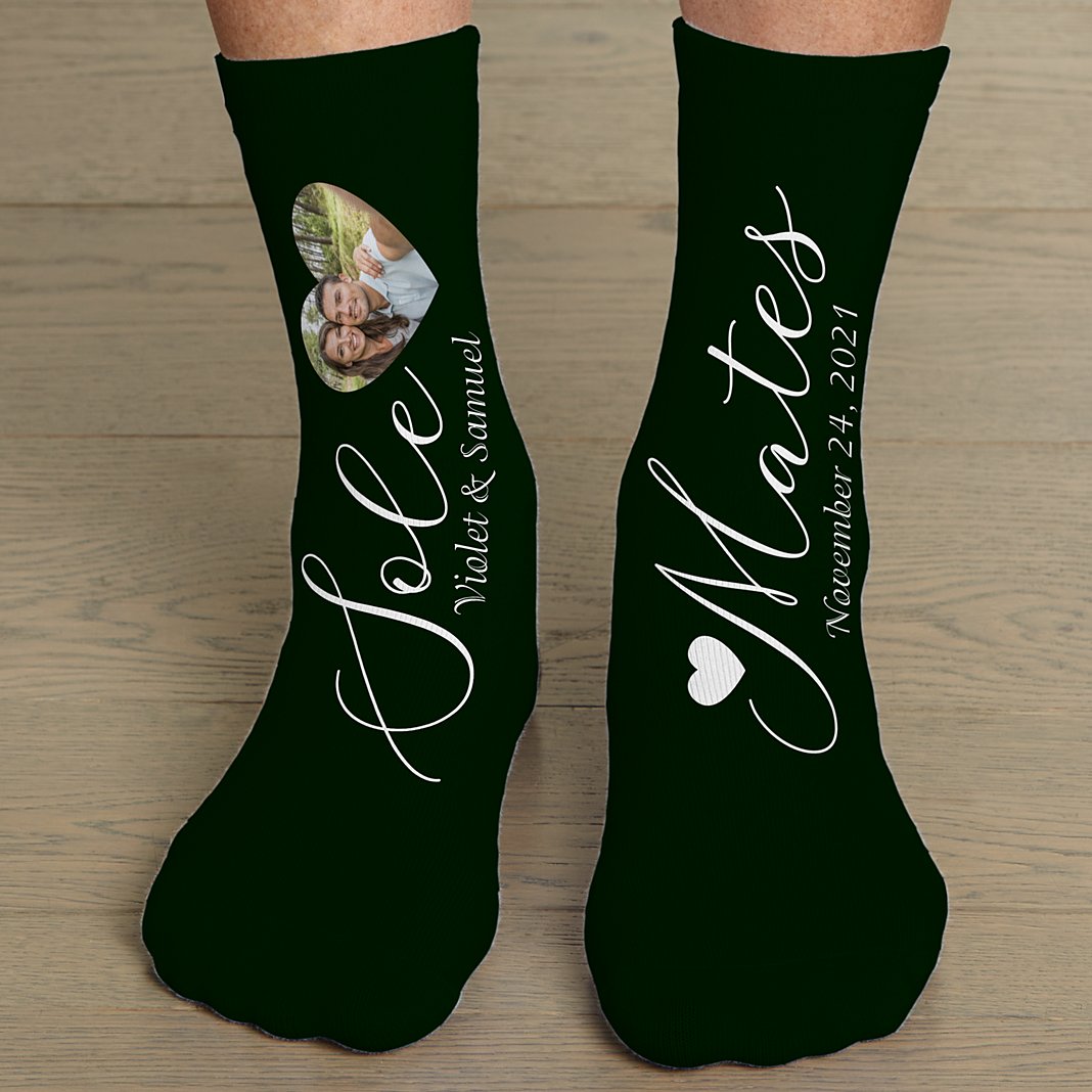 Keep this together-forever twosome on their toes with this fun footwear that proclaims their love for each other. Unisex crew socks made of polyester/spandex blend Measures 3.5"x13.5"; Fits Mens size 6-11; Fits Women up to size 12 Personalize with any photo and 2 line message up to 22 characters each; first line will be under "Sole", second line will be under "Mates" “Sole Mates” will always appear Machine washable