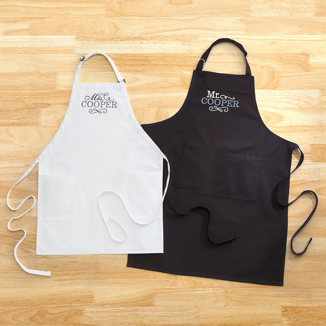 Stir up a lasting romance with our super-cute his-and-hers aprons. Ideal for bridal showers and wedding gifts! Made of wrinkle- and stain-resistant white cotton/poly twill blend Two handy front pockets to hold cooking utensils Black apron measures 36"L; White apron measures 30"L with 1"W strap with adjustable buckle at neck One size fits most Machine washable for easy care Personalize with any last name up to 12 characters. Includes one “Mr.” apron (black) and one “Mrs.” apron (white) Set of 2.