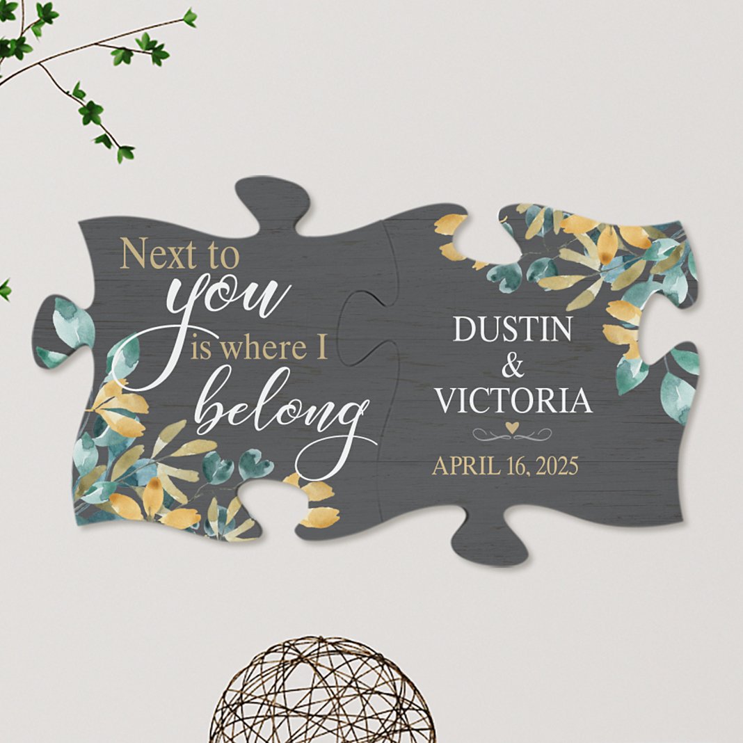 When two people fit so perfectly, its a beautiful thing—as this unique tribute to togetherness proves. It's a sweet gift for the newly married or your own special someone. Made of wood composite Keyhole back for hanging Set of 2 pieces, each measures 6" sq Personalize with any 3 line message up to 12 characters each and 1 line message on the bottom up to 20 characters