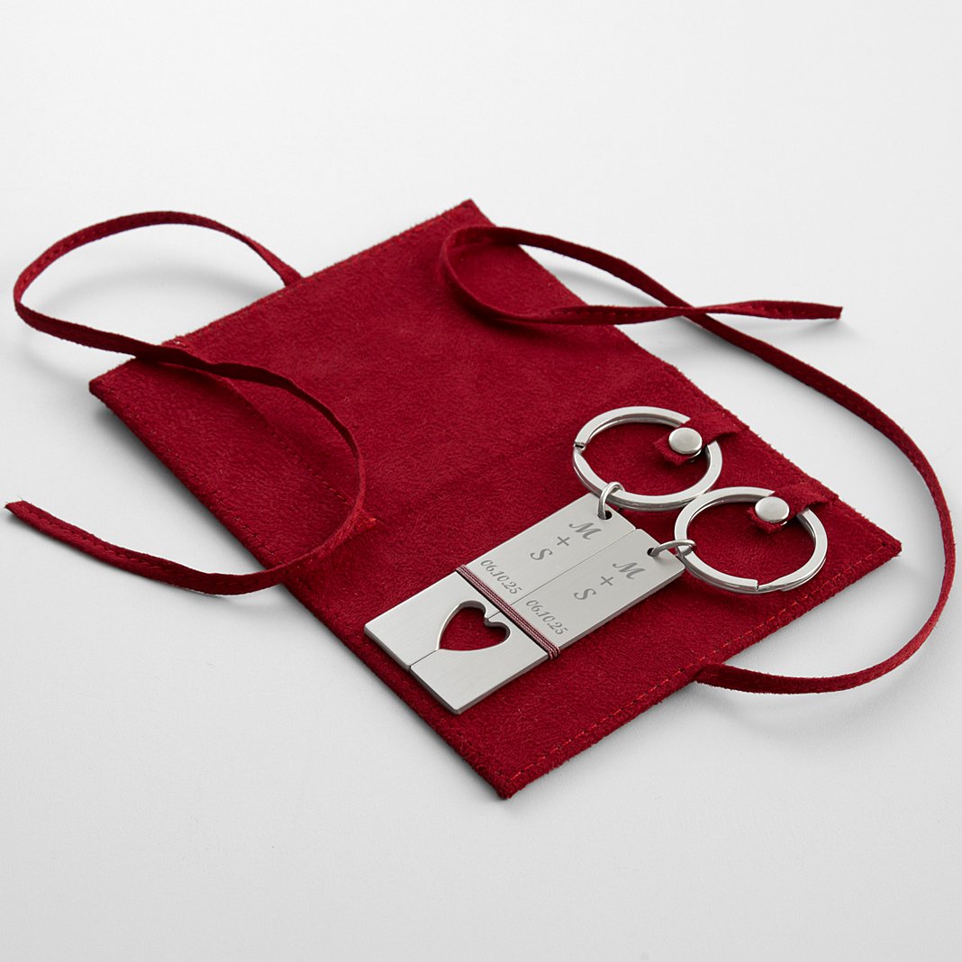 Where would you be without your better half? These key chains say it loud and clear, telling your sweetie, "You complete me." Coming as a set of two, when paired, the two key chains form a complete heart. Separately, the slim key chains accommodate keys and pull double duty as bottle openers. Made of Stainless Steel. Pair arrives in a berry-colored faux-suede portfolio for ultra-romantic presentation. Each key chain measures 4" long overall. Case measures 3-1/4"Wx4-1/2"H. Personalize the open text version with any 1-2 line message up to 18 characters per line and the initial & date version with any 2 initials and any date (use mm.dd.yy) The same message will appear on both key chains