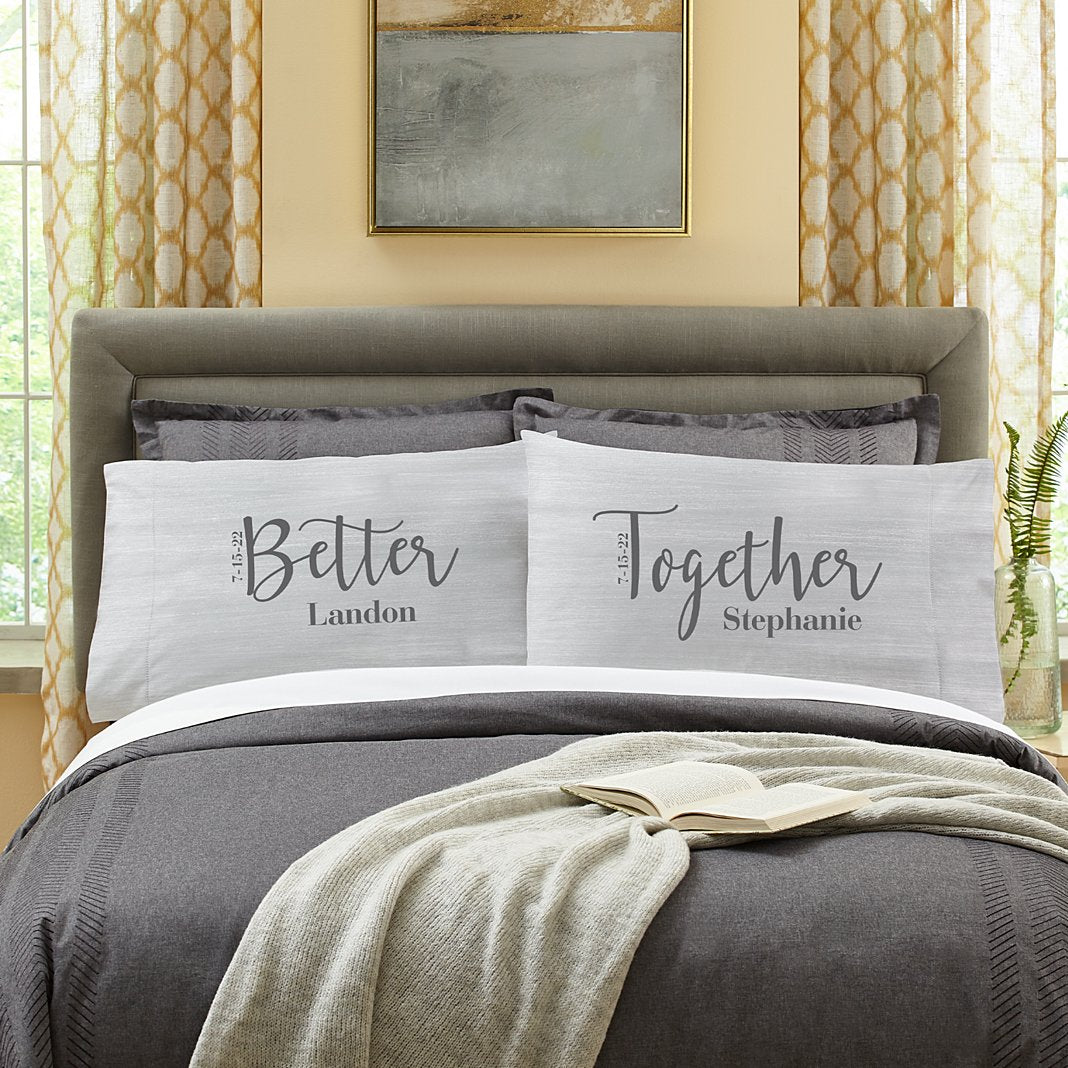 Newlyweds—or any couple—will happily agree with the romantic statement this pair of pillowcases makes. Made of 100% polyester microfiber Measures 20"x30" (to fit a standard-size pillow) Set of 2 Personalize with any 2 names up to 10 characters each and an optional numeric date Name 1 will be on "Better" and Name 2 will be on "Together" If date is entered, it will appear on both pillowcases Machine washable