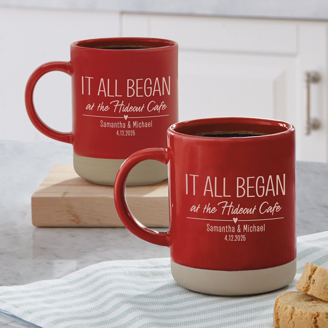 What could be sweeter than taking your first sip from a mug with the time and place that you first met? Perfect for morning coffee with your favorite, or gift to another special couple! And to make it even sweeter, we've added a Classic Milk Chocolate Bomb drizzled with white chocolate to satisfy that sweet tooth! This happy memory is sure to get mornings off to a great start! Made of stoneware with beautiful braised bottom. Lovingly personalize with any message up to 25 characters, names/message up to 25 characters, and date "It All Began" will always appear Available in red, blue and teal Milk Chocolate Bomb: milk chocolate shell filled with hot chocolate mix and marshmallows drizzled with white chocolate Single serving Mug holds 15 oz. Measures 4 7/16"Hx3 7/16" dia. Set of 2 Dishwasher, freezer, oven and microwave safe