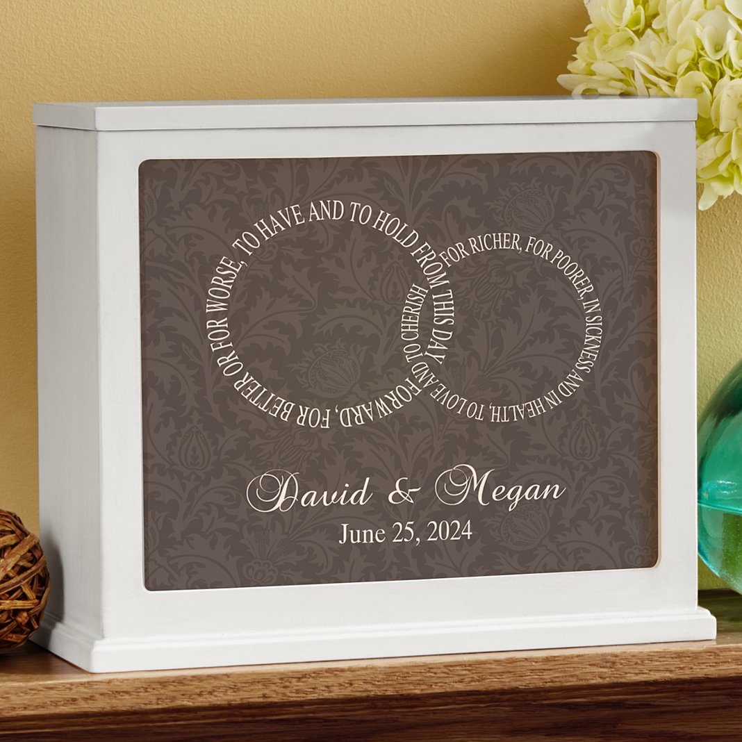 The intertwined rings and vintage backdrop will always remind the happy couple of the day their two lives became one. Made of wood and acrylic Features power cord with on/off switch Includes 7 Watt Type C Bulb Indoor use only Personalize with any message up to 20 characters and date Measures 10-1/4"Wx8-3/4"Hx4-3/8"D Item cannot be gift boxed