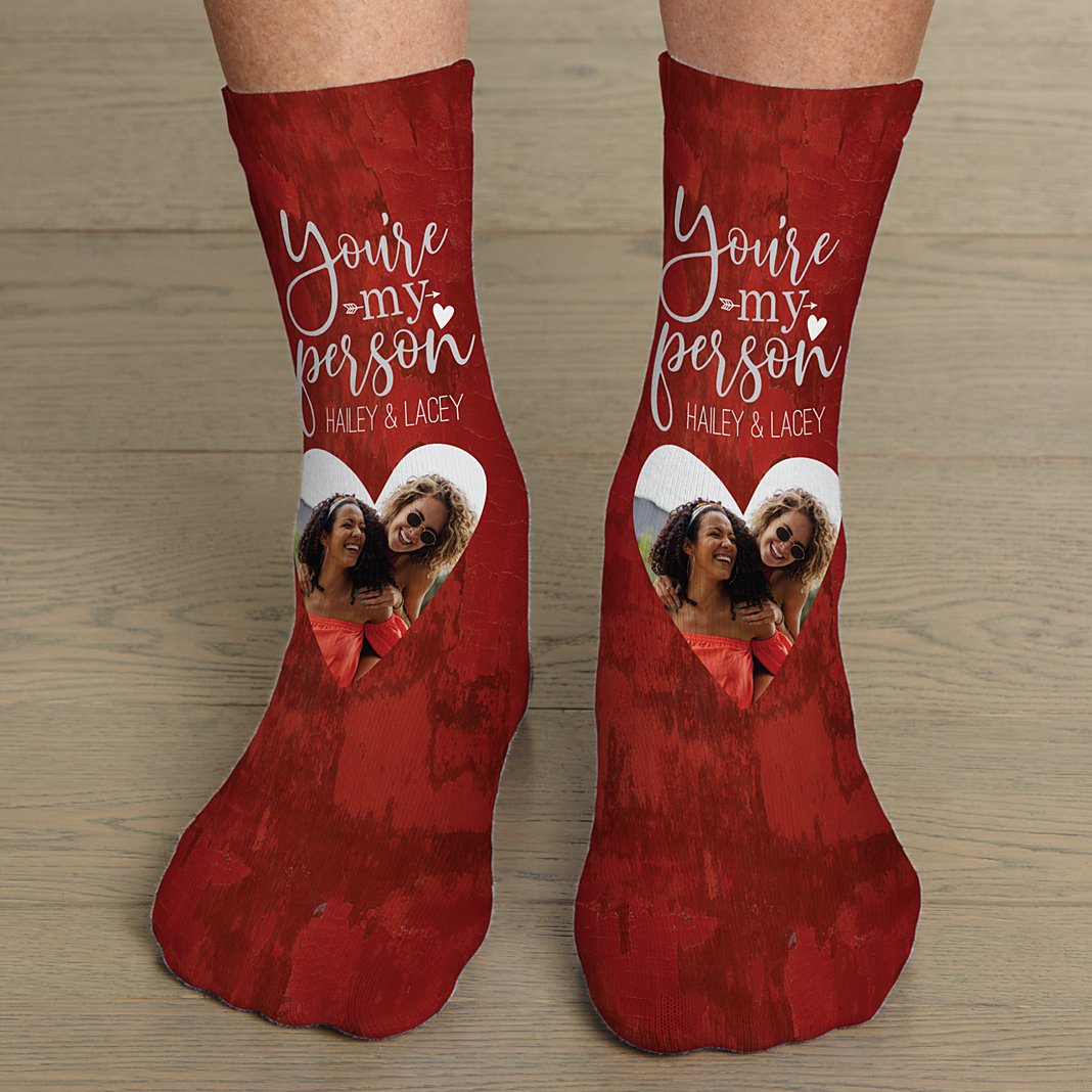 Theyre the one! The person you lean on, through all lifes ups and downs. Let them know how much you care with this fun-loving footwear. Unisex crew socks made of polyester/spandex blend Measures 3.5"x13.5"; Fits Mens size 6-11; Fits Women up to size 12 Photo measures 3.25" dia. Personalize with any photo and any 1 line message up to 22 characters Machine washable