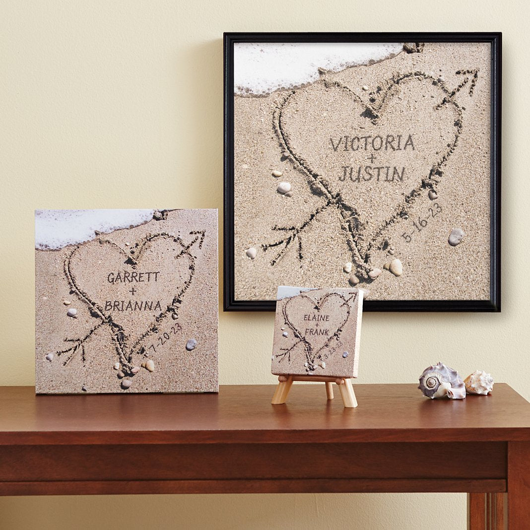 Celebrate memories of romantic strolls on the beach with a gift that showcases their love. Our Heart in Sand Collection honors the timeless tradition of sweethearts drawing their names in the sand, letting all who see it know they are truly made for each other. Heart in Sand Print: Hight quality print comes framed under glass Stylish square black frame measures 16" Thoughtfully personalize with any 2 names up to 9 characters each and a 2-digit month, date and year. “+” will always appear Gift box not available Proudly made in the USA