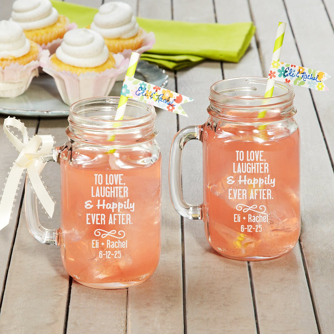 Our old-time mason jars make a fun and unique way to toast a wedding or anniversary. Made of glass. Dishwasher safe. Personalize with any 2 names up to 10 characters each and numeric date. The "+" will always appear. Measures 5"H. Holds 16 oz. Set of 2. Due to the crafted nature and rustic design, each piece will be unique and will contain variations in glassware