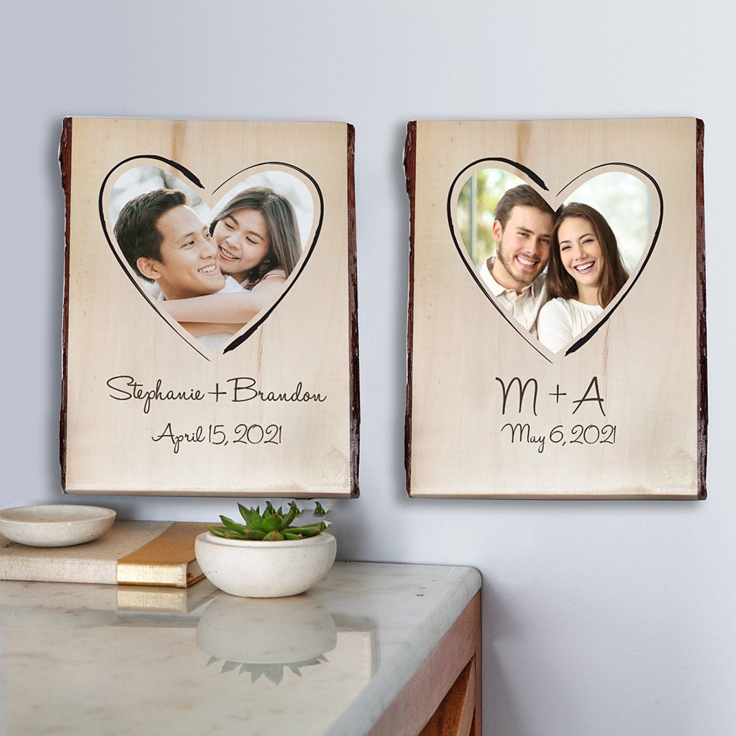 The simple beauty of this natural wood plaque underscores their truth—a true love will stand the test of time. Exclusively from Red Envelope. Made of wood Includes sawtooth hanger Measures approx. 9"x12" Available in Color and Laser design Personalize Color design with any photo, any 2 initials or 2 names up to 12 characters each and any message up to 30 characters; Personalize Laser design with any two initials or 2 names up to 12 characters each and optional year Due to the natural nature of the wood, size and color may vary slightly