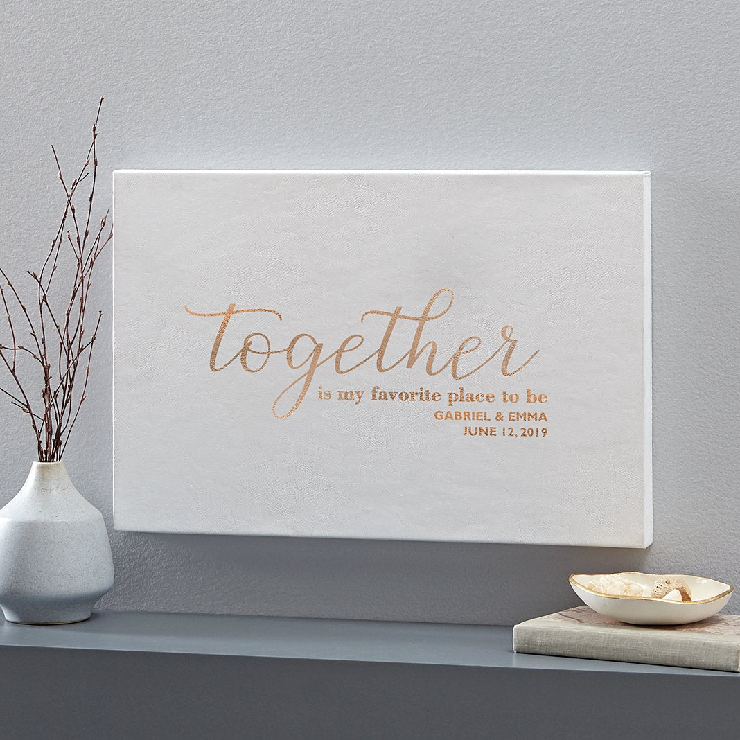 Such a sweet sentiment! And such a stylish addition to a bedroom or any living space. Fashioned with the rich look of leather, it's a striking reminder that your favorite place isn't a place at all—it's a person. Exclusively from RedEnvelope. Made in the USA Made of synthetic leather stretched over a wood frame Decorative top stitching around all edges Stamped graphics add dimension to the design Sawtooth hanger for easy hanging Measures 12"Hx18"W Available in black with silver metallic, gray with black, rustic brown with gold metallic or white with gold metallic Engrave with any 1 or 2 line message up to 22 characters each "together is my favorite place to be" will always appear.
