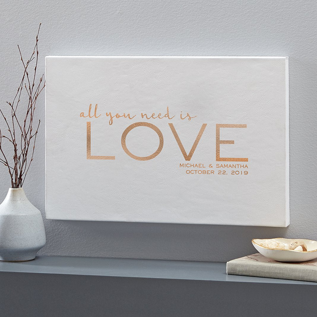 For newlyweds head-over-heels in love, this little phrase spells out just how they feel quite nicely. And, theyll adore how this luxurious leather-look artwork says it with such striking elegance. Exclusively from RedEnvelope. Made in the USA Made of synthetic leather stretched over a wood frame Decorative top stitching around all edges Stamped graphics add dimension to the design Sawtooth hanger for easy hanging Measures 12"Hx18"W Available in taupe with black, black with silver metallic, gray with black, rustic brown with gold metallic or white with gold metallic Personalize with any 1 or 2 line message up to 25 characters each "All you need is love" will always appear