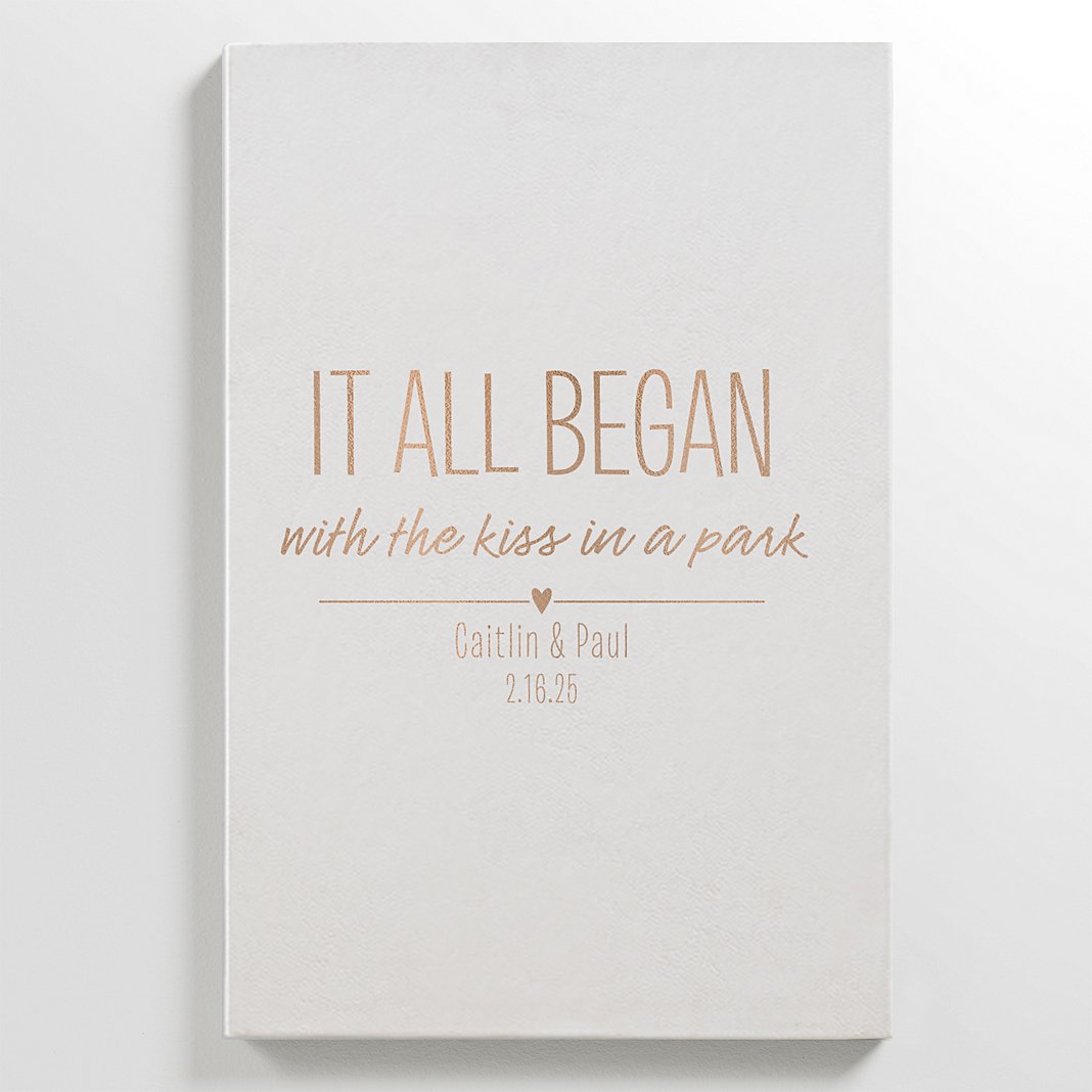 A striking way to fete a momentous occasion, this inspired gift captures the magic of a couple's first meeting. Fashioned with the look and texture of leather, this stylish work of art will help them recall the thrill of the day with every passing glance. Exclusively from RedEnvelope. Made in the USA Made of synthetic leather stretched over a wood frame Decorative top stitching around all edges Stamped graphics add dimension to the design Sawtooth hanger for easy hanging Measures 12"Wx18"H Available in taupe with black, black with silver metallic, gray with black, rustic brown with gold metallic or white with gold metallic Personalize with any message up to 25 characters, names/message up to 25 characters and date "It All Began" will always appear
