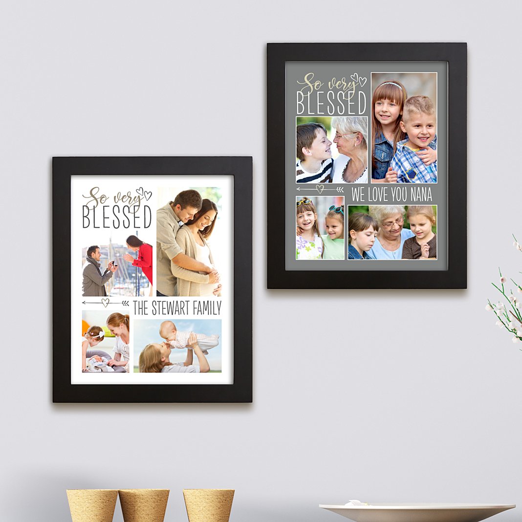 Each time you pass this lovely photo display, think of those who have blessed your life and made it full and abundant. Print comes protected under glass a black wood frame Measures 13"x16" Available in aqua, gray and white Personalize with 4 photos and any message up to 20 characters "So very blessed" will always appear Item cannot be gift boxed