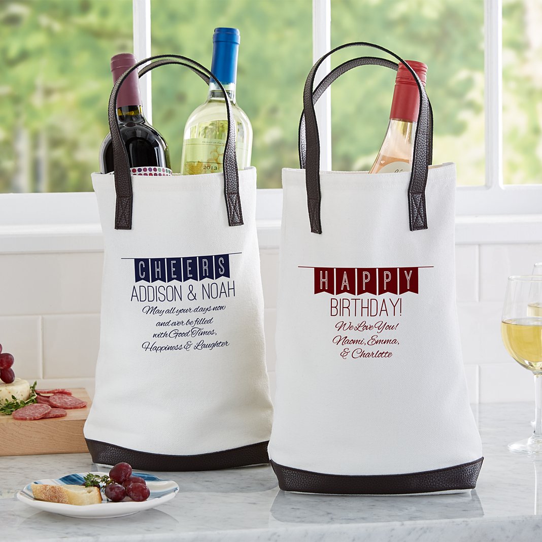 Red or white? Whatever you choose, our tote—featuring your special message—will always get the good times started. Made of cotton, rayon, polyester blend with synthetic leather trim Measures 14"Wx17"Hx4"D Available in navy, black, gray and burgundy Spot clean Will hold 2 standard (750ml) sized wine bottles Personalize with any message on the banner up to 9 characters, title line up to 16 characters and 1 to 4 lines up to 22 characters each