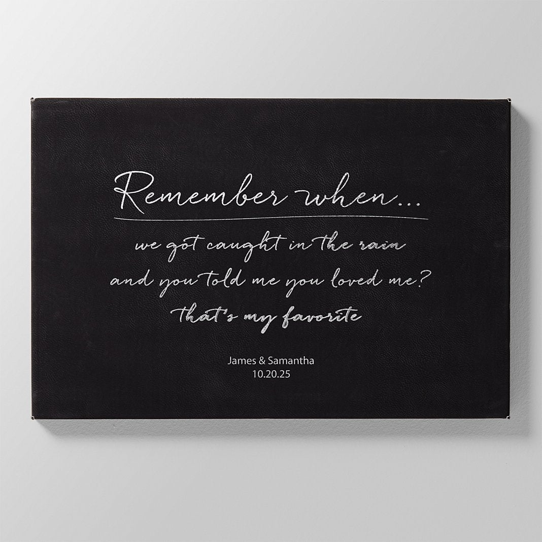 Take a beautiful stroll down memory lane with this unforgettably elegant leather artwork. Celebrating a special romantic moment (or three) that captivated your hearts, its a timeless testament to your enduring love. Exclusively from RedEnvelope. Made in the USA Made of synthetic leather stretched over a wood frame Decorative top stitching around all edges Stamped graphics add dimension to the design Sawtooth hanger for easy hanging Measures 12"Hx18"W Available in black with silver metallic, gray with black, rustic brown with gold metallic or white with gold metallic Engrave with up to 5 lines: Script Message on 3 lines up to 35 characters each and 2 optional Block Lines up to 22 characters each "Remember when" will always appear