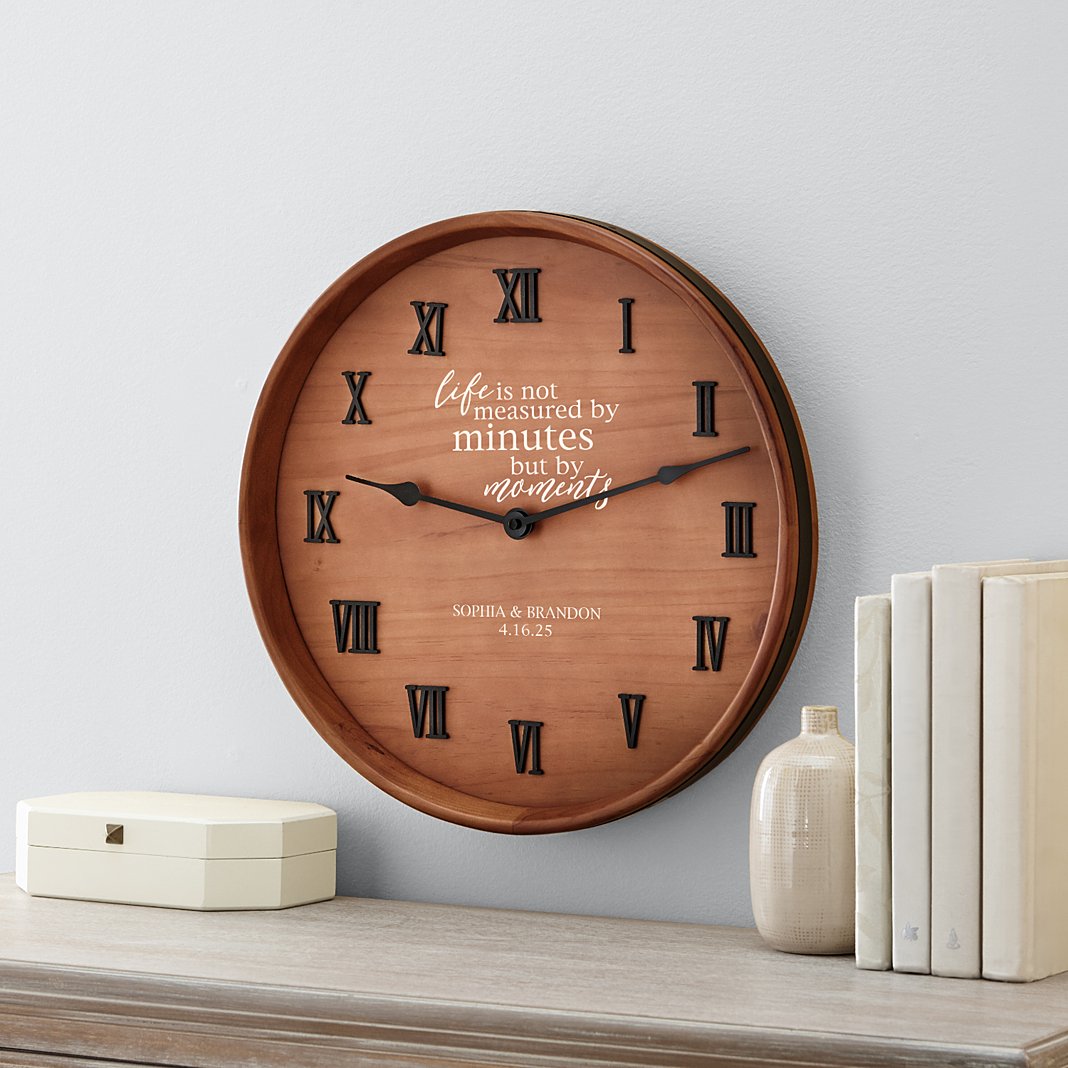 Our clock does far more than stylishly tell time. Its a reminder to make the minutes count by embracing every special moment together. This wine barrel-inspired design makes the perfect accent piece in their new home. Exclusively from RedEnvelope. Made of pine wood with galvanized banded edge Measures 1-3/4"Dx18" dia. Engrave with any 2 lines up to 22 characters each Uses one AA battery (not included)