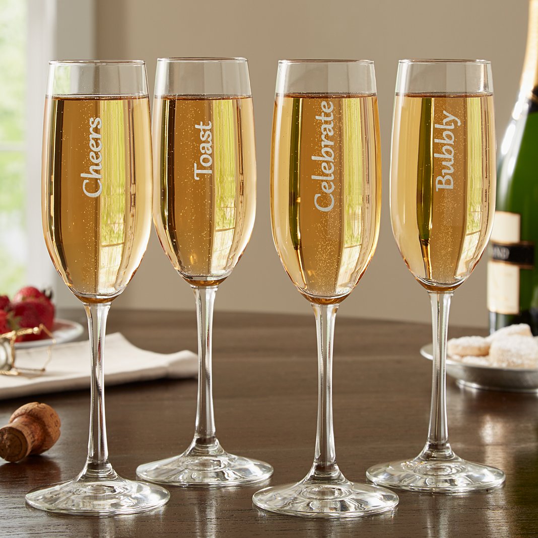 Celebrate life's happy moments with custom champagne flutes engraved just for them. Engrave with their name or a fun drinking message, these flutes make the perfect gift for groomsmen, best friends, spouses or birthdays! Made of glass. Comes packaged as a set of 4. We personalize each flute with any message or name, up to 10 characters. Each glass holds 8 oz. Measures 9.25”H Hand wash recommended.