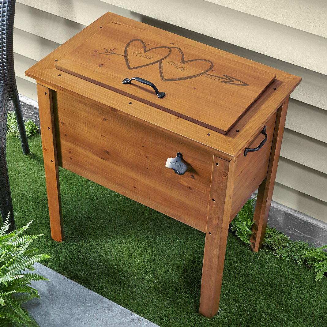Now your favorite couple can toast the day they tied the knot and keep their drinks chilled with this ultra-cool ice chest—the classic design looks great inside and out. Made of fir wood Bottle opener mounted to the side for easy beverage opening Inside made of galvanized metal with drain for easy clean-up Holds up to 60 lbs. Measures 27.5"Wx30"H overall; cooler measures 13.75"D Assembly instructions included Personalize with 2 line message up to 25 characters on the first line and up to 18 characters on the second line "Eat, Drink & Be Married" will always appear Item cannot be gift boxed Due to size and packaging requirements, item will ship separately from other items in your order and an oversized item fee may apply at checkout