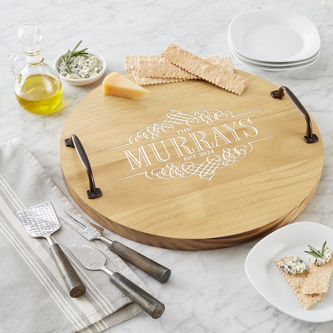 Serve some sophisticated charm along with your drinks and snacks with this handsomely crafted tray. When not used for entertaining, its elegant enough to display on a coffee table, buffet or kitchen island. Made of pine wood with an artisan stain Due to natural variations of the wood, each tray will be unique Hand wash with warm soapy water and hand dry To preserve, we recommend treating with a wood conditioning mineral finish "The" and "Est." will always appear Personalize with any family name up to 12 characters and established year Measures 15" dia.; 1"H, excluding handles Optional 3-pc cheese knife set available; includes cheese knife, cheese fork, and cheese spreader Knife set made of mango wood with stainless steel blades and comes packaged in gift box Personalization not available for knife set