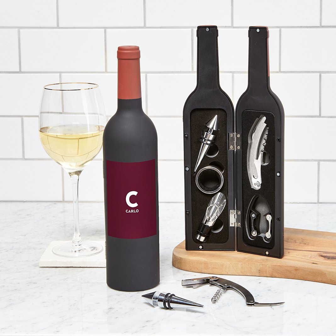Is it wine or is it a 5-piece tool set to open their favorite wine with ease? Hint: it's the latter! This is the perfect gift for the wine connoisseur in your life. Made of stainless steel and zinc alloy in a plastic case Plastic case measures 2.81"x12.75" Includes wine opener, foil cutter, wine stopper, drop-stop collar and wine spout tools Wipe clean with a dry cloth
