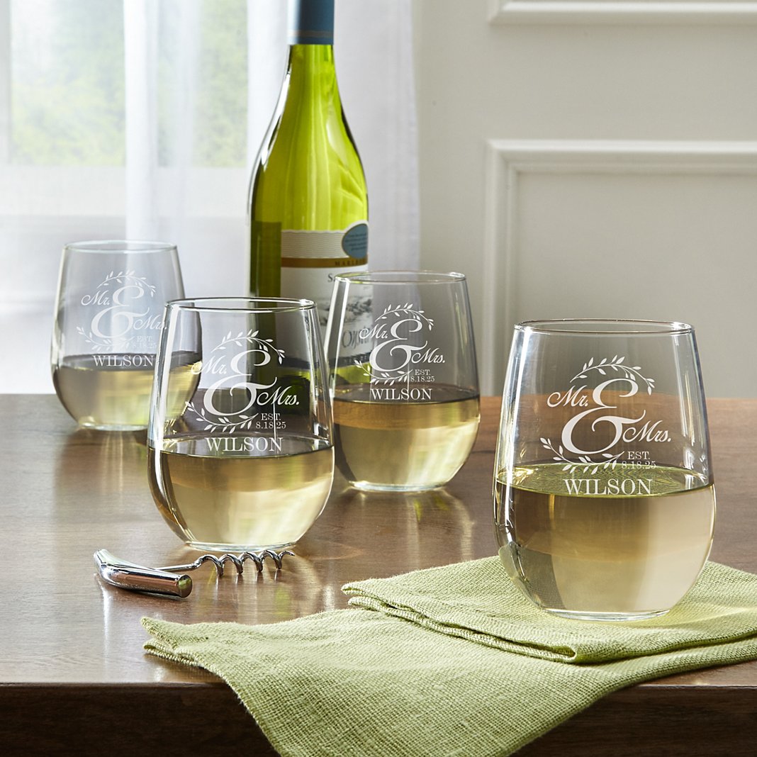 These glasses will always be half full! Embrace and celebrate all the joy and happiness this loving couple have found. Made in USA Stemless glass holds 17 oz., measures 4”H; stemware holds 18.5 oz., measures 9"H Sold as a set of 2 and 4 Available in stemmed or stemless Available in Mr./Mrs., Mr./Mr. and Mrs./Mrs. design Personalize with any name up to 12 characters and any date "&" and "EST." will always appear Dishwasher safe