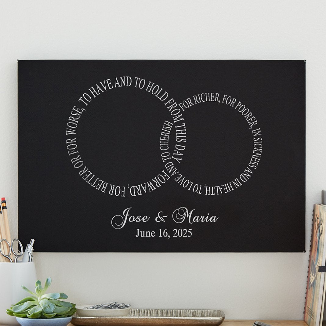 Leather may be the traditional 3rd anniversary gift, but this artwork is so uniquely romantic, it's perfect for celebrating any year. Made of synthetic leather stretched over a wood frame Decorative top stitching around all edges Stamped graphics add dimension to the design Sawtooth hanger for easy hanging Measures 12"Hx18"W Available in black with silver metallic, gray with black or white with gold metallic Personalize with any message up to 20 characters and date