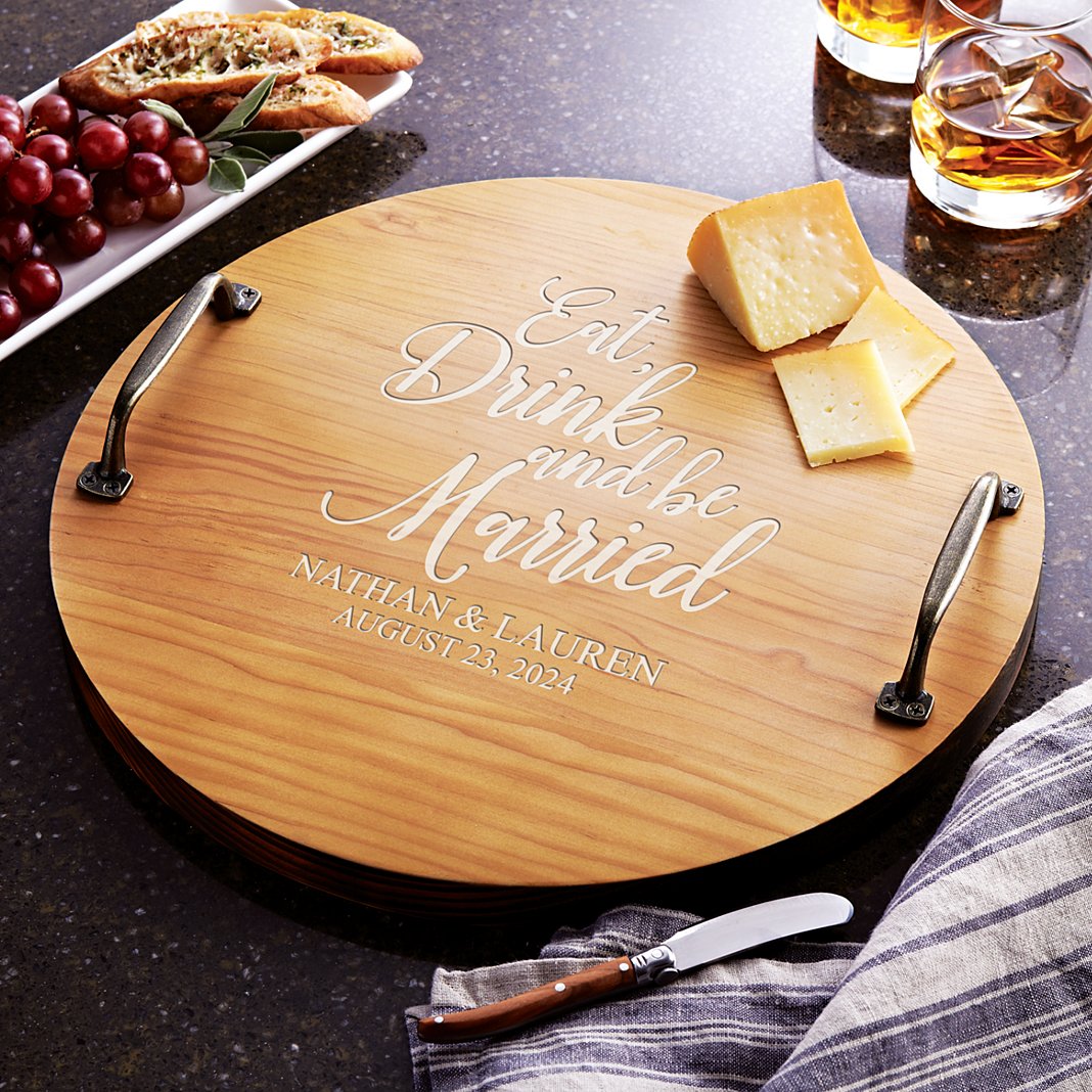 Celebrate the newlyweds with a one-of-a-kind gift that invites friends and family to wine and dine in style. What an elegant yet practical way to serve up a lifetime of happiness! Crafted of solid pine and finished with an artisan stain Measures 15" dia.; 1"H, excluding handles Due to natural variations of the wood, no two trays are exactly alike Thoughtfully engrave with any 1- or 2-line message up to 22 characters on the first line and up to 32 characters on the second line "Eat, Drink and be Married" will always appear Easily hand wash with warm soapy water then hand-dry To ensure long-lasting beauty, periodically treat with a wood conditioning mineral finish Gift box not available