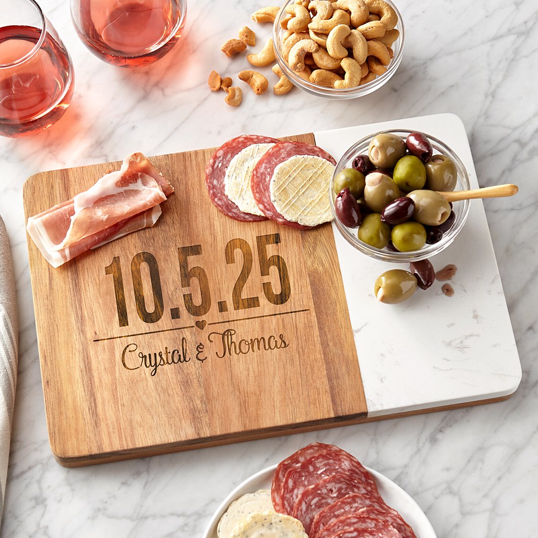 A meaningful way to serve the appetizers, this marble and wood board celebrates the day you married. Made of rubberwood and marble Measures 12"L x 8"W Personalize with any numeric date up to 10 characters and any 1 line message up to 25 characters Wipe clean with damp cloth; not suitable for dishwasher or microwave