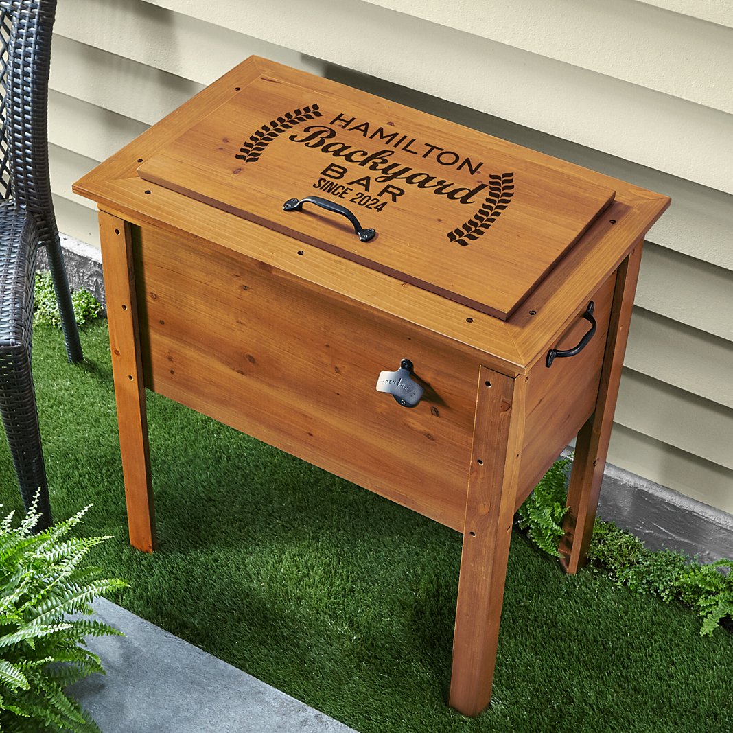 What better way to say thank you to the family thats always ready to host a good time. This chic cooler is sure to see them through a lifetime of merry gatherings. Made of fir wood Bottle opener mounted to the side for easy beverage opening Inside made of galvanized metal with drain for easy clean-up Holds up to 60 lbs Measures 30"Lx27-1/2"Wx17"H Assembly instructions included Item cannot be gift boxed Personalize with any message up to 16 characters and year "Backyard Bar" and "Since" will always appear Due to size and packaging requirements, item will ship separately from other items in your order and an oversized item fee may apply at checkout