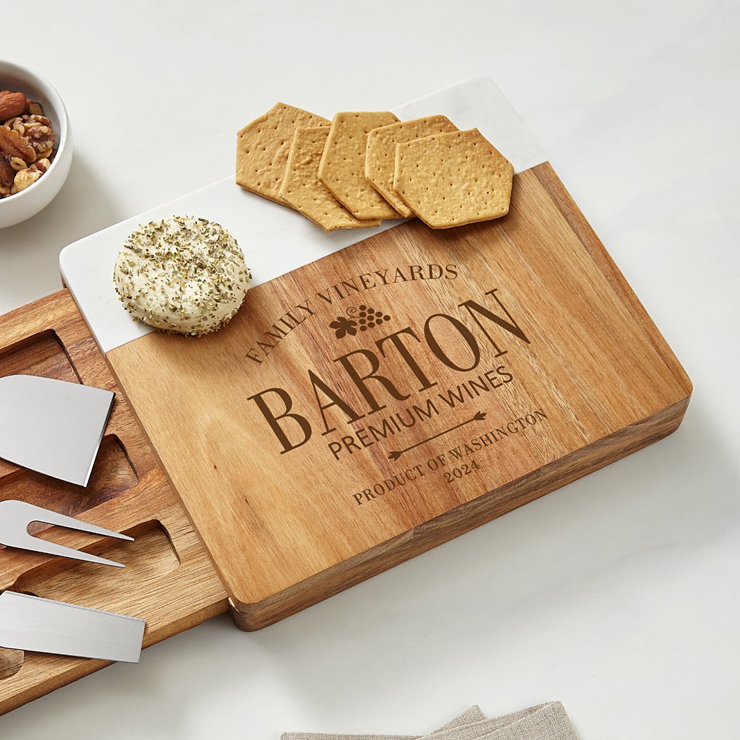 For wine and cheese and everything in between. This beautiful custom board is ready for all your holiday entertaining. Made of acacia wood and non-stick faux marble Add a special touch when you personalize with any top message up to 20 characters, any name up to 12 characters and any 2-line message, up to 30 characters on each line Measures 8”Lx9"Wx1.5"H Due to natural variation of wood and marble, each board will be unique Easy to wipe clean with damp cloth Includes 3 tools