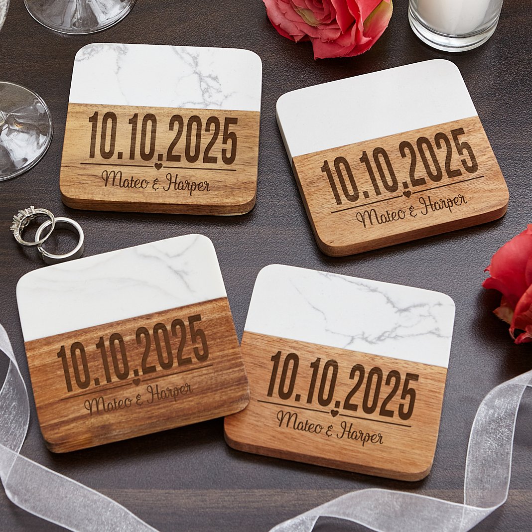 A practical gift that tells your story, these coasters mark the best day of your life. This unique set is perfect for anniversaries or special occasions you dont want to forget. Made of marble and wood Due to natural variation of wood and marble, each coaster will be unique Set of 4, each measures 4" sq. Personalize with any numeric date up to 10 characters and any message up to 25 characters