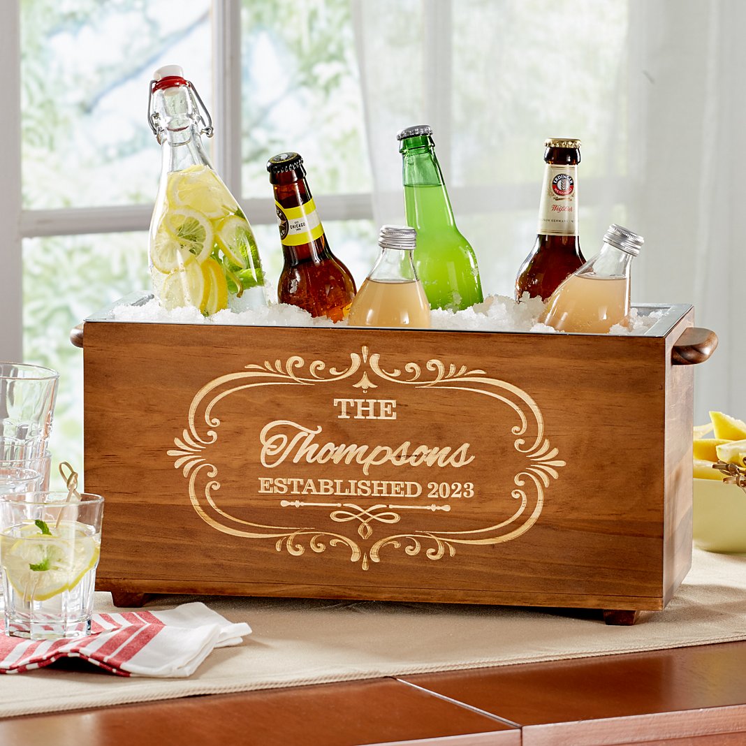 With its rustic look and elegant graphic, our chiller will be the center of the party! Inside or out, it makes an ultra-cool way to keep drinks cool. Made of pine wood Comes with a removable galvanized metal insert to prevent the wood from getting wet To clean, wipe with a damp cloth and avoid excessive moisture "The" and "Established" will always appear Measures 19-1/2"Wx7-1/2"Dx8-1/2"H Engrave with any name up to 12 characters and year Item cannot be gift boxed