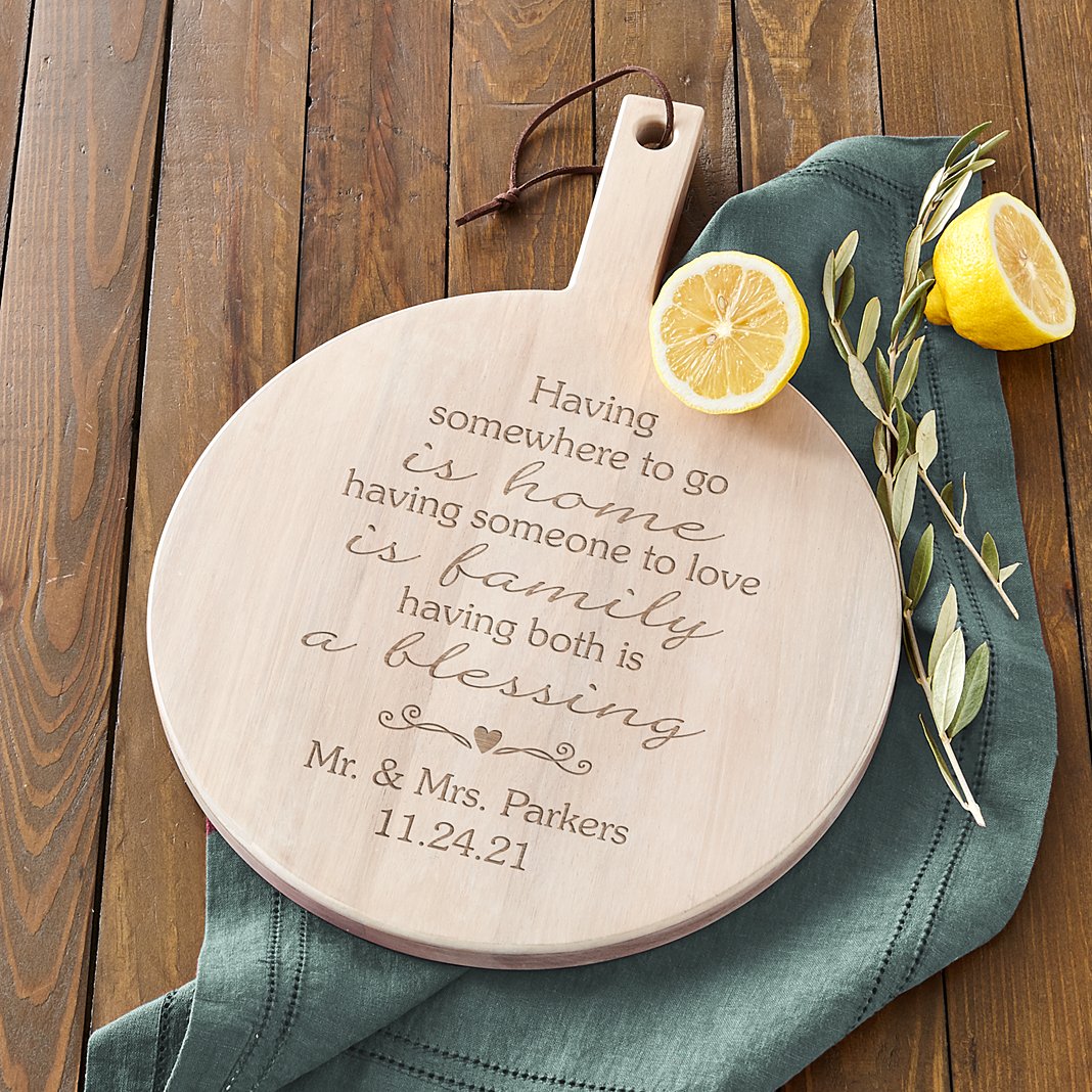 Embrace family and all the flavor they bring to your life. Wood server makes a beautiful wall display and is great for entertaining, too! Made of durable acacia wood with beautiful whitewash finish Includes hanging strap Measures 15"Lx11"W Due to natural finish of wood, each server will be unique Personalize with any 2 line message up to 30 characters on the first line and up to 25 characters on the second line Hand wash Product intended for use as a serving piece; if used as a cutting board fading and marks may wear over time Priced as marked, not eligible for further discounts.