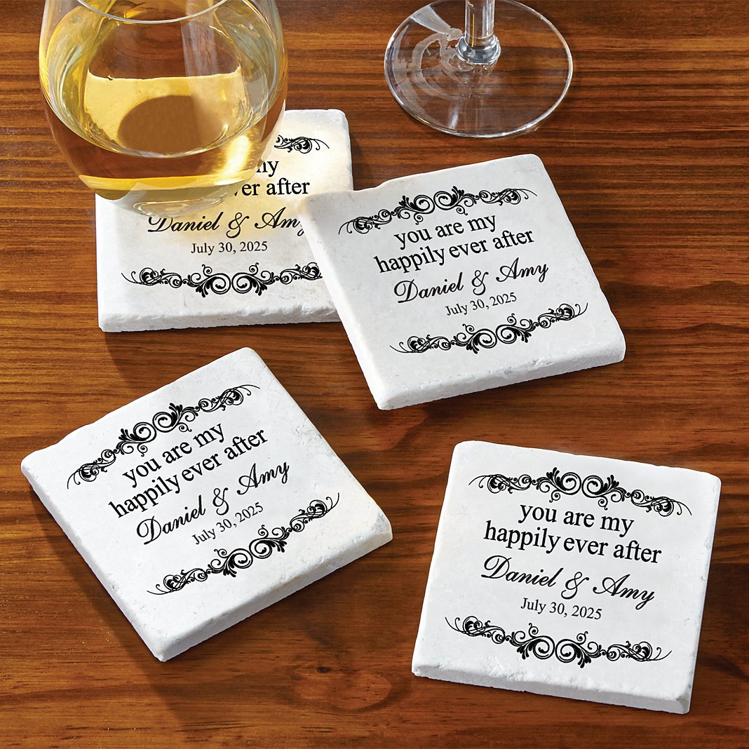 Heres proof their love story is forever—its written in stone! Made of tumbled stone with chiseled edges Protective cork backing Holder is included Set of 4, each measures 4" sq Personalize with any message up to 28 characters and date