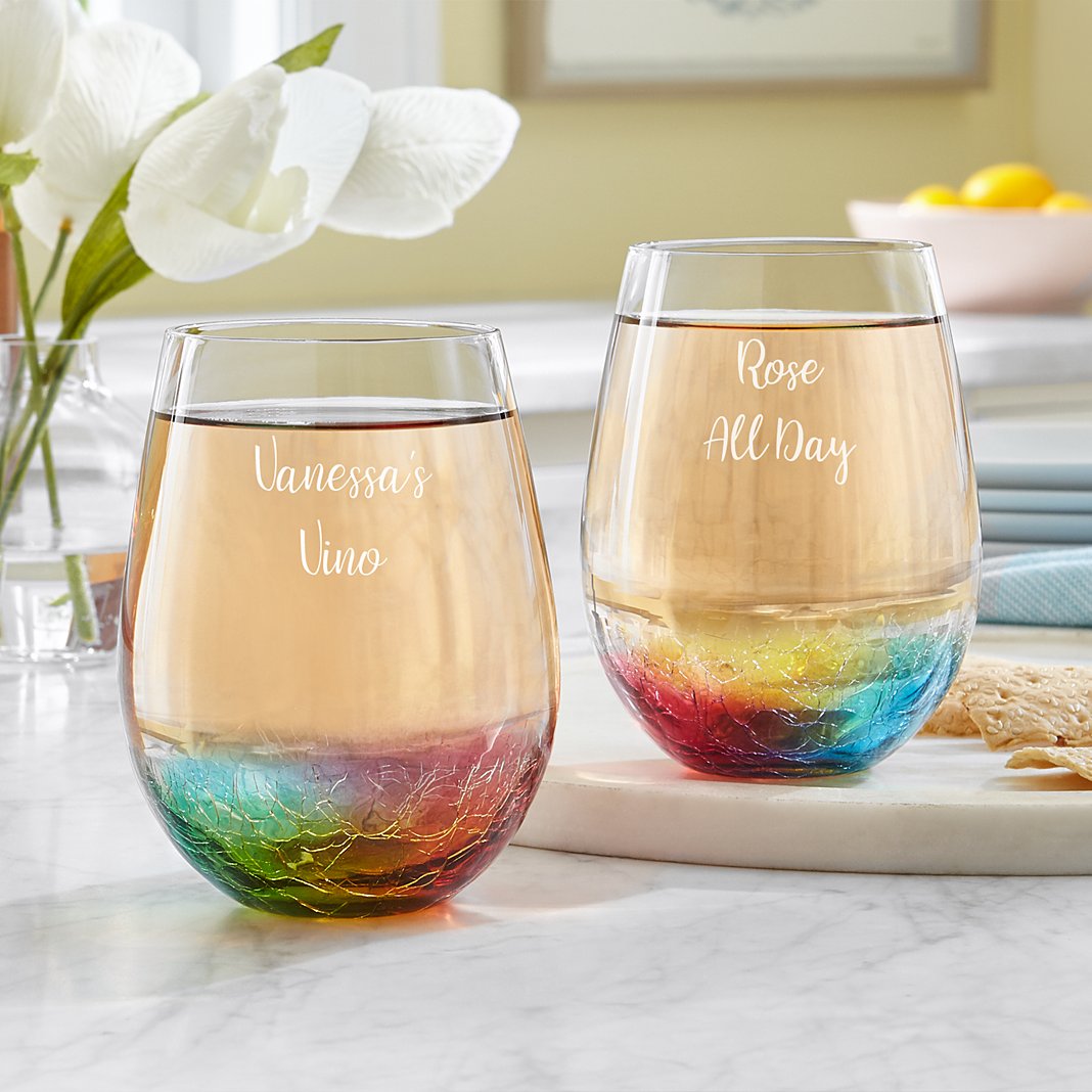 Brighten up the festivities with a spectacular splash of color, courtesy of this wine glass and its distinctive crackle base. Colorful rainbow crackle base Made by hand so each piece will be unique Holds 18 oz.; measures 4.73”Hx3.25” dia. Available individually or as a set of 2 Etch with any 1 or 2 line message up to 16 characters each Hand Wash Only