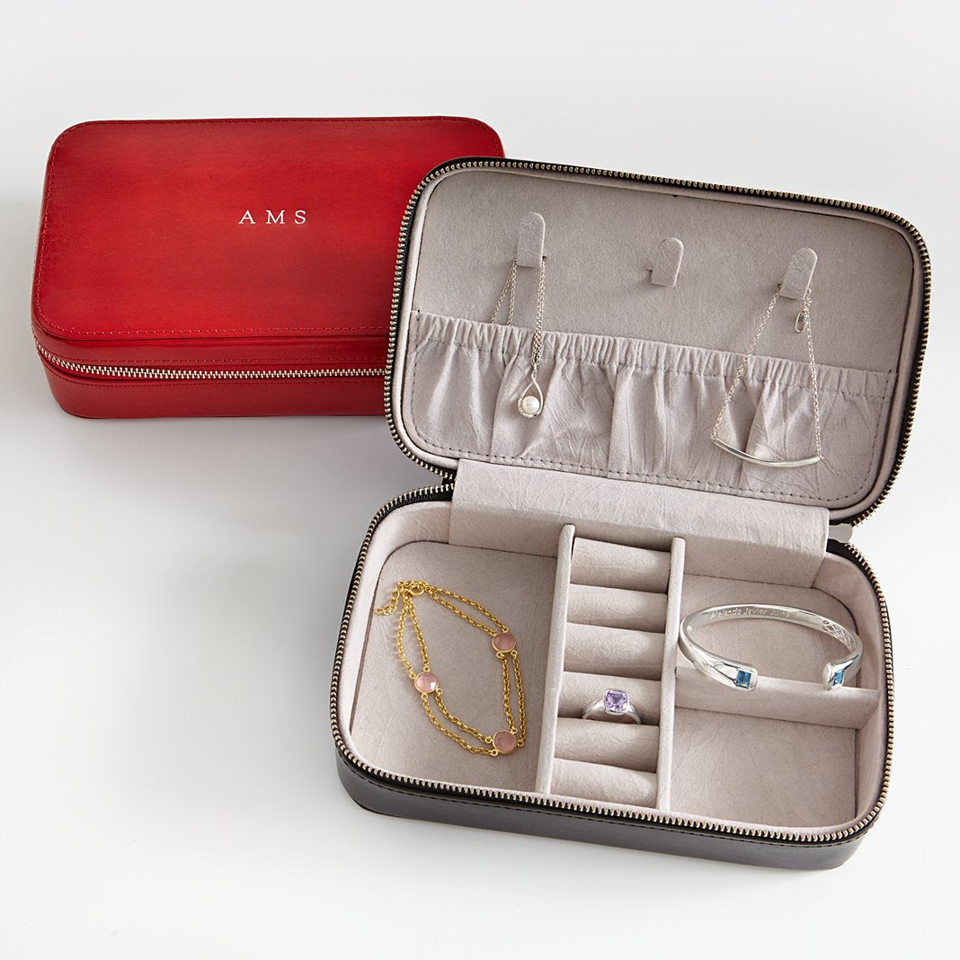 Take your treasures on the road in true luxury. This genuine leather case offers a host of smart storage features to keep your smallest valuables safe, secure and neatly organized. A sophisticated accessory no woman should travel without. Made of genuine leather with gray velvet interior. Measures 7-1/2”Lx4-5/8”Wx2-1/8”H. Interior features 3 compartments, a section for rings, 3 hooks and pocket for necklaces or bracelets. Personalize with any 1 to 3 letter monogram in silver, gold or embossed.