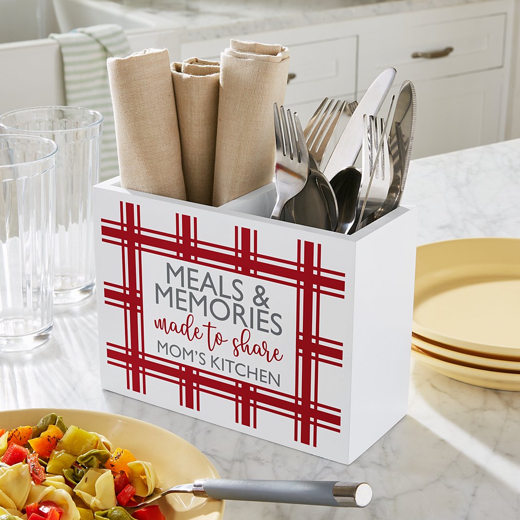 When dinnertime is calling, make sure they have the tools they need in the kitchen. Everything they need for the perfect feast will be handy with this classic wooden caddy nearby. Personalize with any name or 1 line message up to 18 characters Features a center divider and ample storage for easy access to kitchen essentials Made of wood Measures 8"Wx6"Hx3.5"D