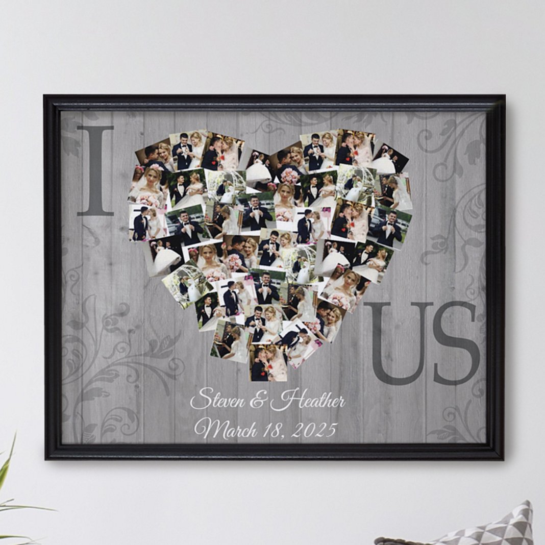 Filled with favorite photos of their lives together, this timeless art will have a special place in their hearts. Canvas is stretched over a solid wood frame Sawtooth hanger included Available framed or unframed in 11"x14", 16"x20" or 18"x24" sizes Personalize with any 2 line message up to 30 characters each Upload 10 photos and an oversized item fee may apply at checkout Item cannot be gift boxed Due to size and packaging requirements, item will ship separately from other items in your order