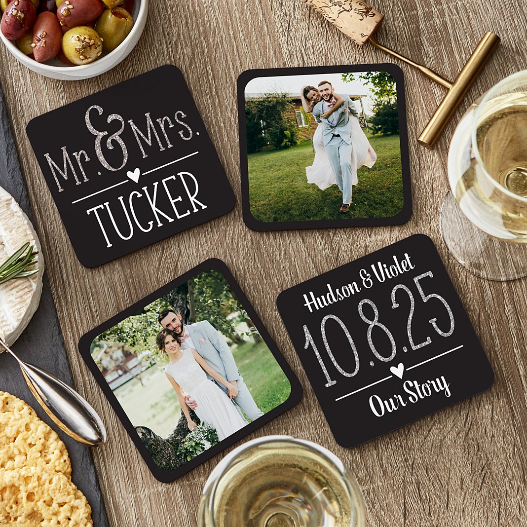 Wedding photos arent just for albums! Put the best snaps of their special day on display at holiday parties, casual dinners, and romantic nights in for years to come. Let those happy moments live on for all to see! Made of MDF with cork backing Personalize first and second coaster with any photo Personalize third coaster with any title (Mr/Mrs, Mr/Mr, Mrs/Mrs) and name up to 10 characters Personalize fourth coaster with any top and bottom message up to 20 characters and date up to 8 characters Choose from 7 colors: champagne, aqua, gray, lavender, pink, black/gold and black/silver Coasters sold as set of four and can be purchased with or without wood coaster holder Measures 3.75" sq.