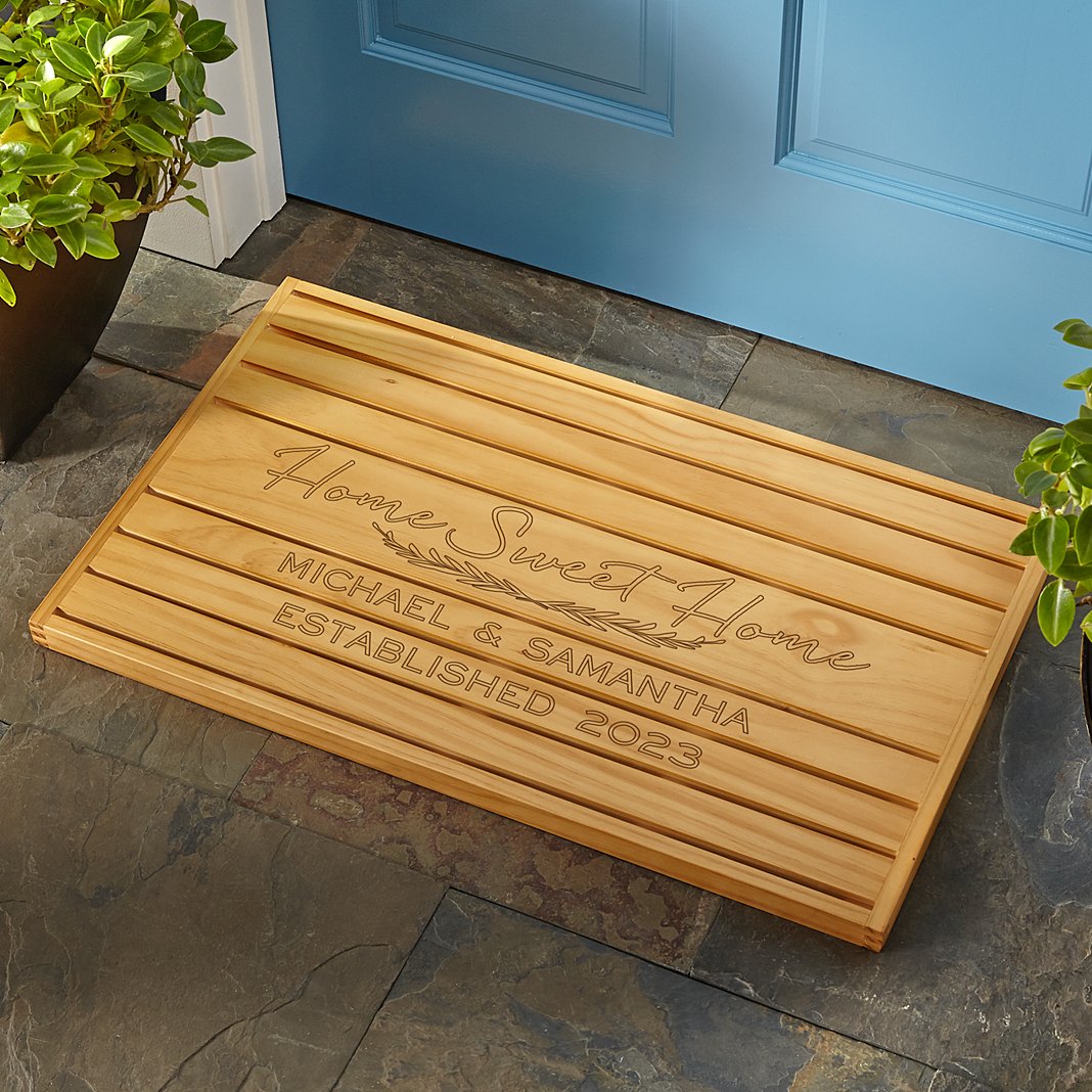 Combining natural beauty and outstanding durability, this slatted mat lets water drain right through. Its ideal for adding an elegant accent to entryways, decks, outdoor showers and hot tubs. A great housewarming gift, too. Exclusively from RedEnvelope. Made of weather-resistant wood Due to natural variations of the wood material, each sign is unique and overall appearance of personalization will vary Measures 30"Lx18"W Personalize with any 1 or 2 line message up to 20 characters each "Home Sweet Home" will always appear Due to size and packaging requirements, item will ship separately from other items in your order and an oversized item fee may apply at checkout