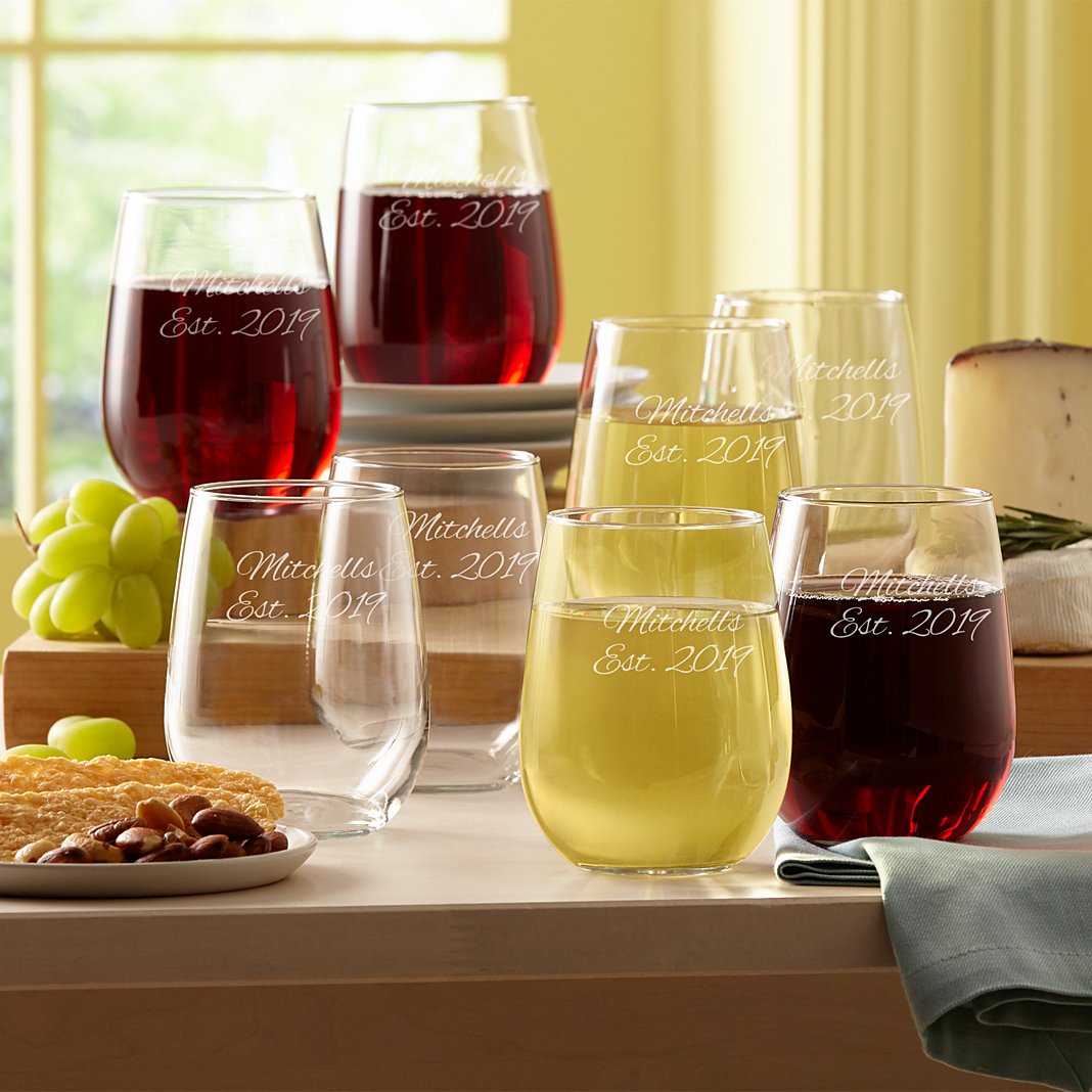 Whether the partys fancy or just the two of you, add a splash of panache—along with your unique message—to any occasion with our classic wine glass. Made in the USA Made of glass Holds 17 oz.; measures 4.5"H Dishwasher safe Available in Initial, monogram or message options Choose from script or block font Personalize message version with any 1-3 line message, up to 14 characters per line; personalize initial version with any initial; personalize monogram version with any 3 letter monogram