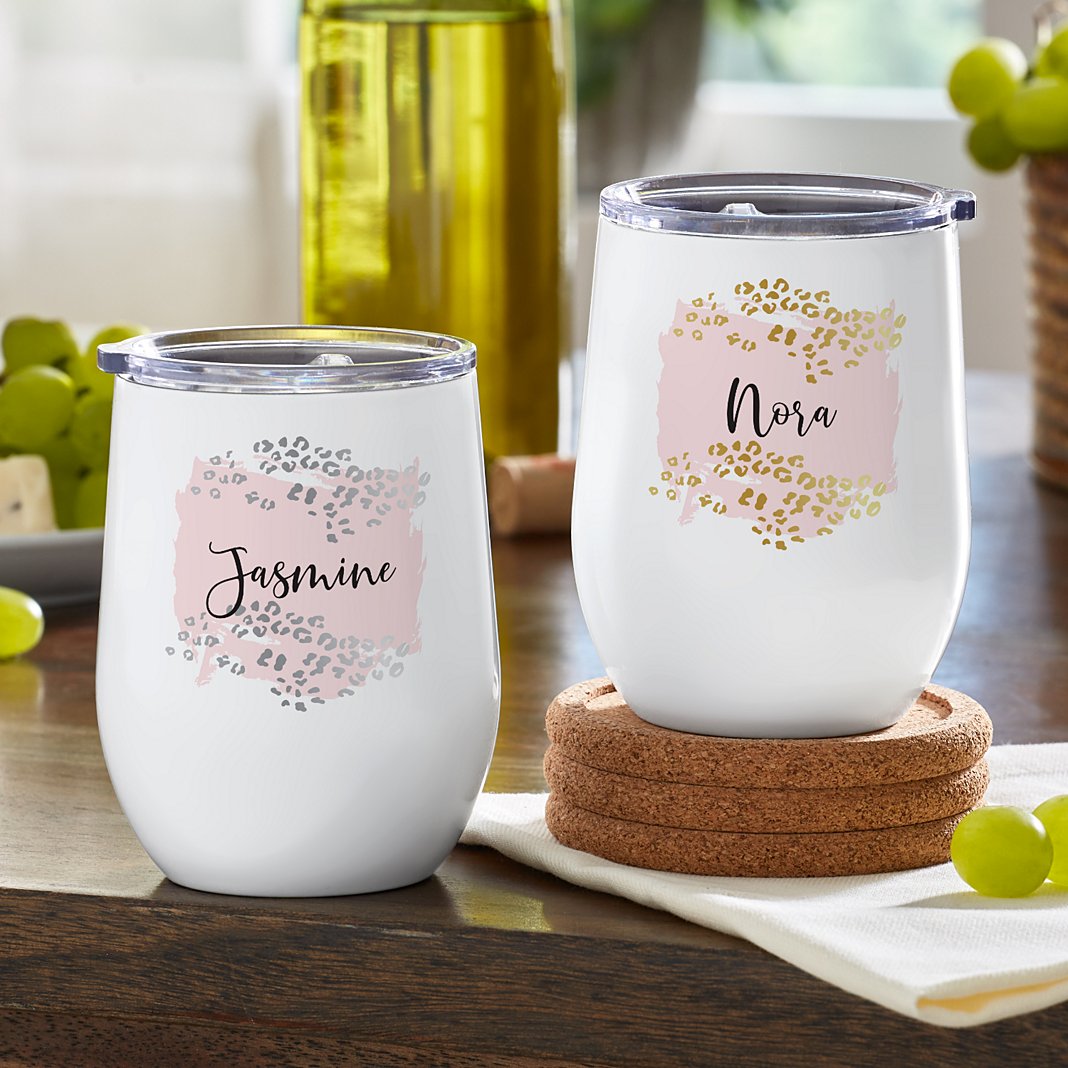 These leopard dots really hit the spot! Sip your wine in sparkling style with this distinctive tumbler. Made of stainless steel with double-wall, vacuum insulation with a clear lid Maintains twice the heat and cold resistance of glass or plastic wine glasses BPA and lead free Holds 12 oz.; measures 5"Hx4" dia. Available in silver and gold Personalize with any 1 line message up to 12 characters
