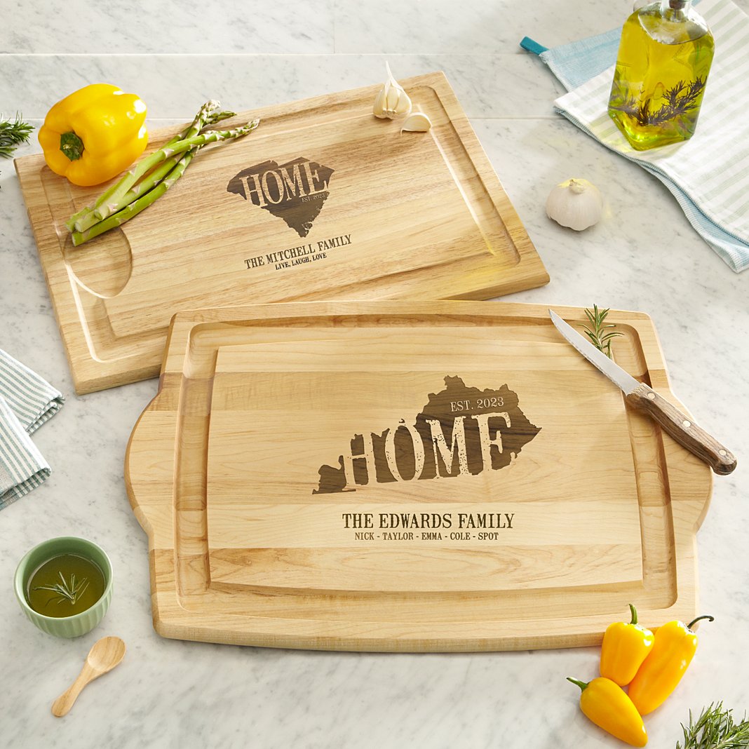 Home cooking takes on an extra-special meaning when prepared with this stylish reminder of just where home is. Made in the USA Made from sustainable maple wood Regular board Measures 12"x17"; Oversized board measures 14"x20" Features a deep moat to collect juices Natural variations in the wood make every piece unique To preserve your cutting board, we recommend treating with a wood conditioning mineral finish Hand wash Personalize with any 2 line message up to 25 characters on the first line and up to 35 characters on the second line, established year and one of the 50 US states "Est" will always appear Item cannot be gift boxed